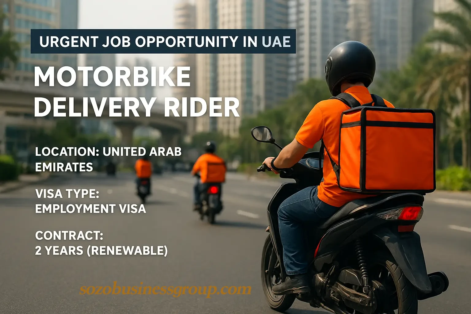 Sozo Human Resources LLC, a sister company of Sozo Business Group, based in Dubai, UAE, is currently recruiting motorbike riders for leading companies in the UAE. This is a great opportunity for motivated candidates to work with established delivery platforms with competitive salary structures and commission packages.